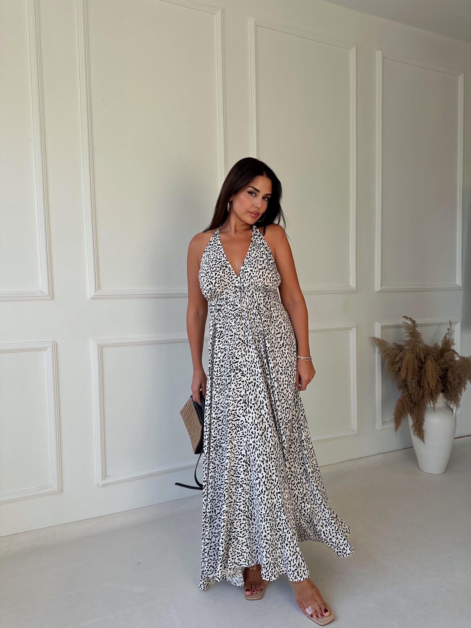 Boyundan Bağlamalı Sırt Dekolteli Siyah-Beyaz Leo Desenli Maksi Elbise (2088)