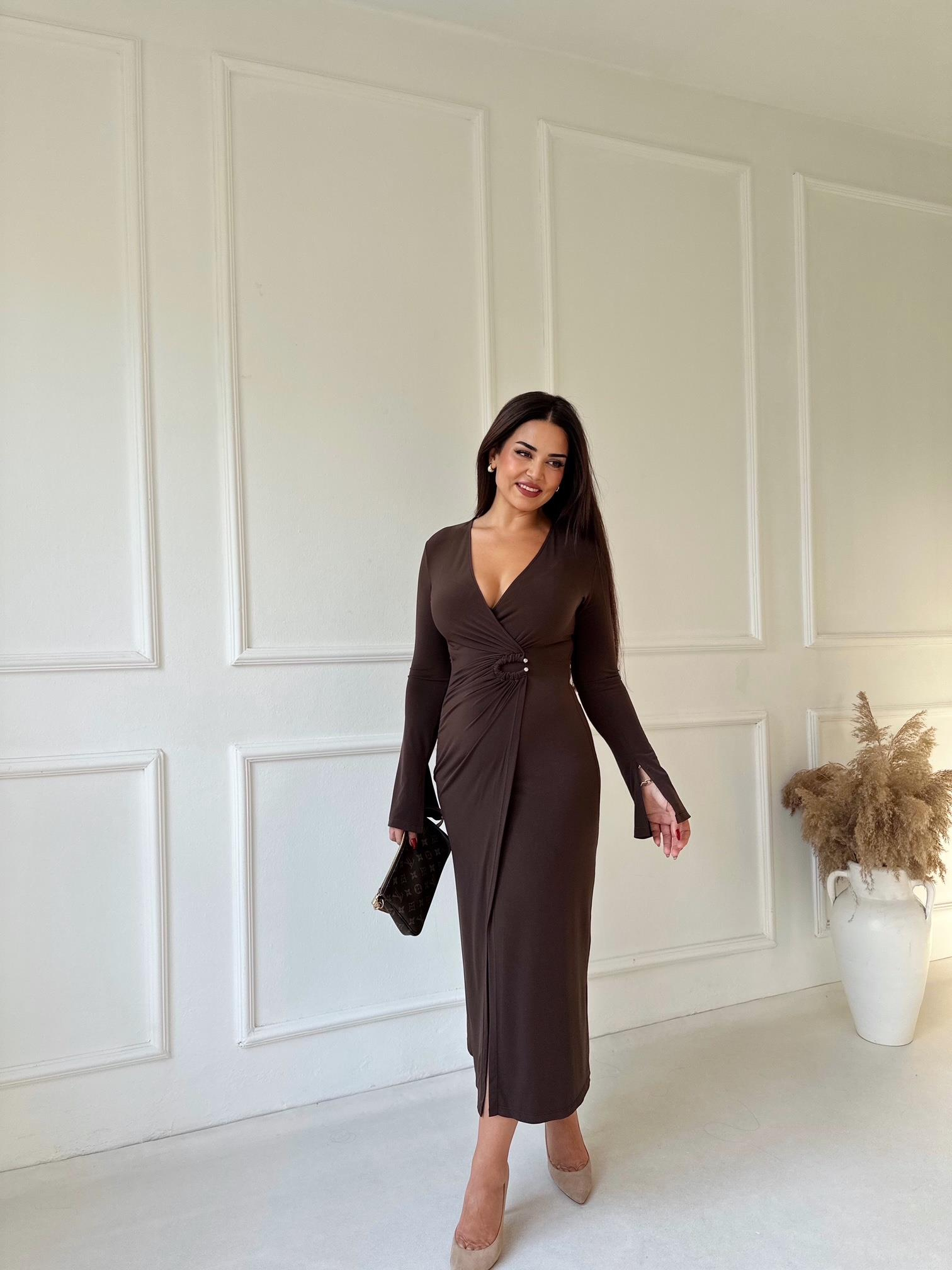 Lüks Kalite Tokalı Kahve Kruvaze Midi Elbise (2116)